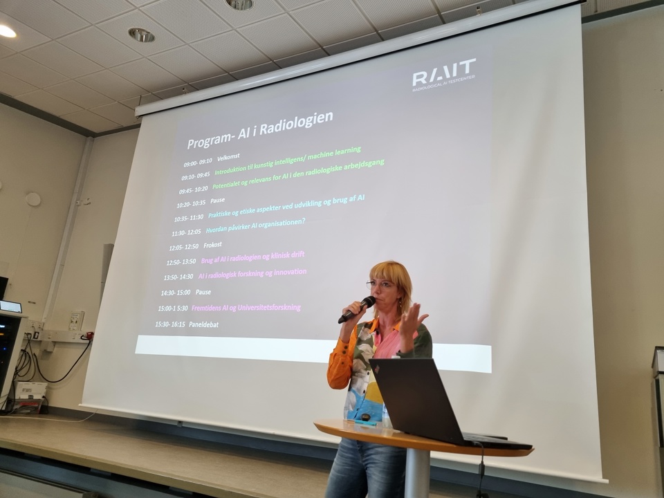 Charlotte Trap-Kinberg, projektleder i RAIT og moderator på dagen forklarer om behovet for fokus på AI: "Der er så store muligheder og interesse for AI i sundhedsvæsenet, og der er også stort potentiale for, at AI kan være med til at løse nogle af vores udfordringer. Men der er mere i det end blot at trykke på en knap og så er algoritmen i brug. Derfor er det vigtigt, at vi gør hinanden klogere og diskuterer de problemstillinger, der er".