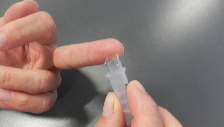 Prik hul i fingeren, som når du måler blodglukose. Led blodet (8-10 store dråber) ned i prøveglasset.