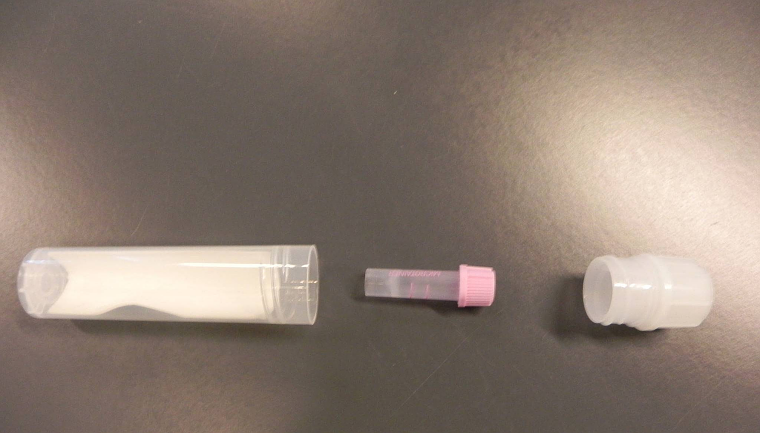 Skriv klokkeslæt og dato på prøvetagningsblanketten og sæt den største stregkode fra blanketten på langs af prøveglasset. Læg glasset i det store forsendelsesrør og skru låget godt fast.