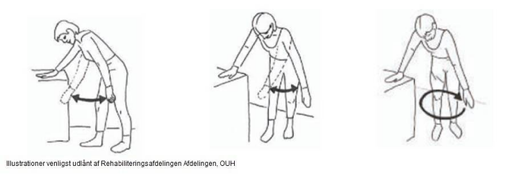 Stræk og bøj i din albue. - Bevæg håndled op og ned og vend og drej. Sving armen som et pendul frem og tilbage - foran kroppen og langs siden. Udfør roterende bevægelser med armen/skulderen - "som at røre i en gryde". Bevægelserne skal laves både højre og venstre om. Udfør disse øvelser 3 gange