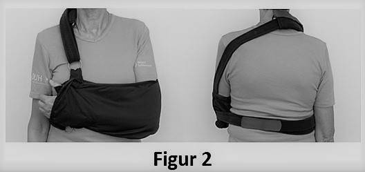 - Når du går omkring uden armslyngen kan du, når hånden skal hvile, lægge den på brystet, så den peger op mod modsatte skulder.