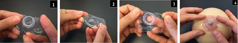 Den er lavet af silikone og placeres på brystvorten, udmiddelbart inden barnet lægges til.