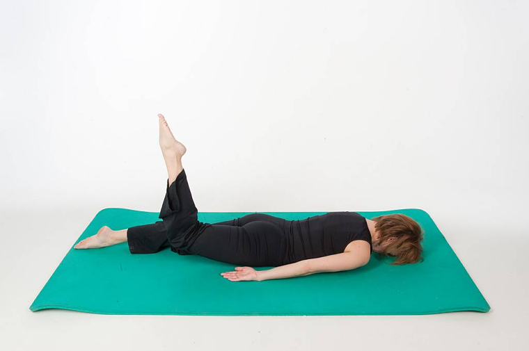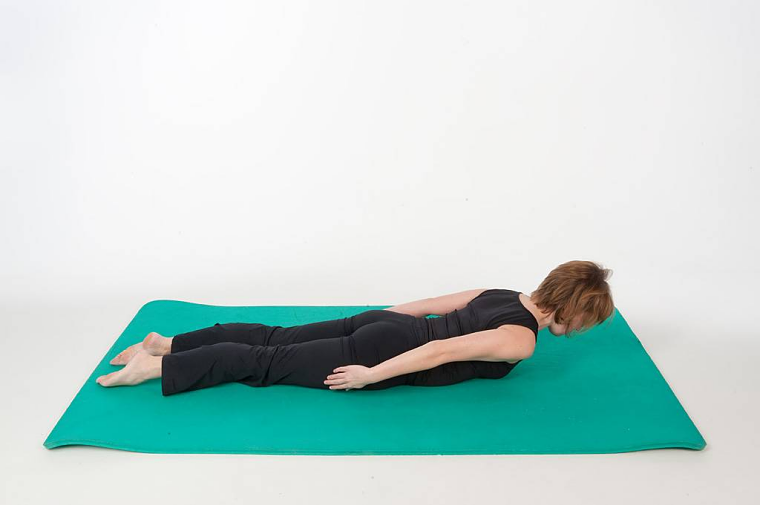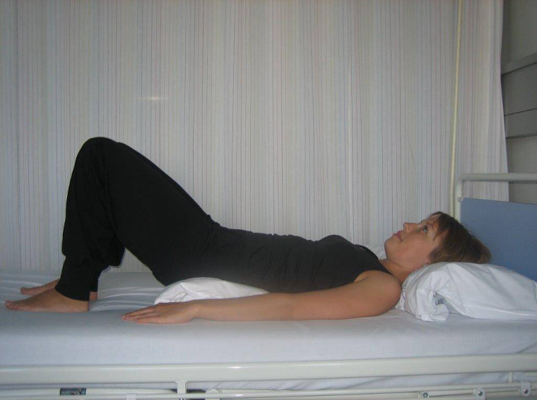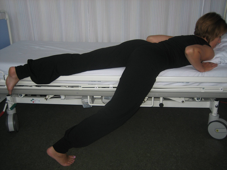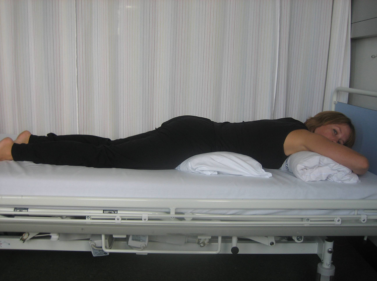 En hvilestilling hvor en pude under maven aflaster lænden.