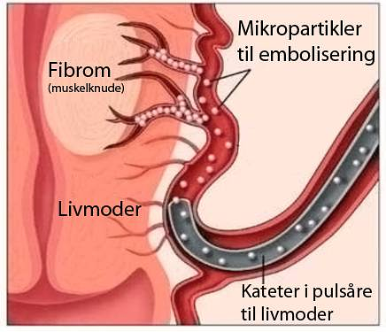 Behandlingen foregår på Røntgenafdelingen og varer 1-2 timer. Du får lokalbedøvelse, og lægen fører et lille rør ind i en blodåre i lysken eller håndleddet. Gennem røret sprøjtes små plastkugler ind, som lukker blodkarrene til muskelknuderne. Livmoderen får fortsat blod fra andre blodkar og tager derfor ikke skade.