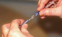 10. Tryk langsomt, mindst et halvt minut, stemplet helt i bund. Træk herefter kanylen ud og smid den I den gule kanyleboks.