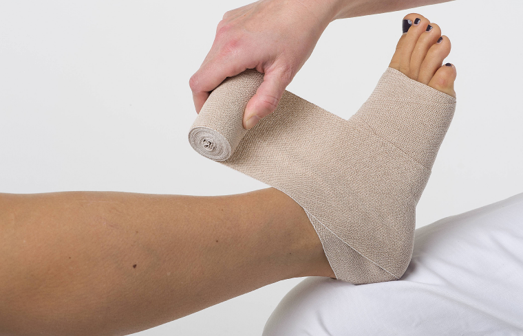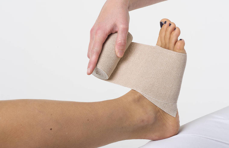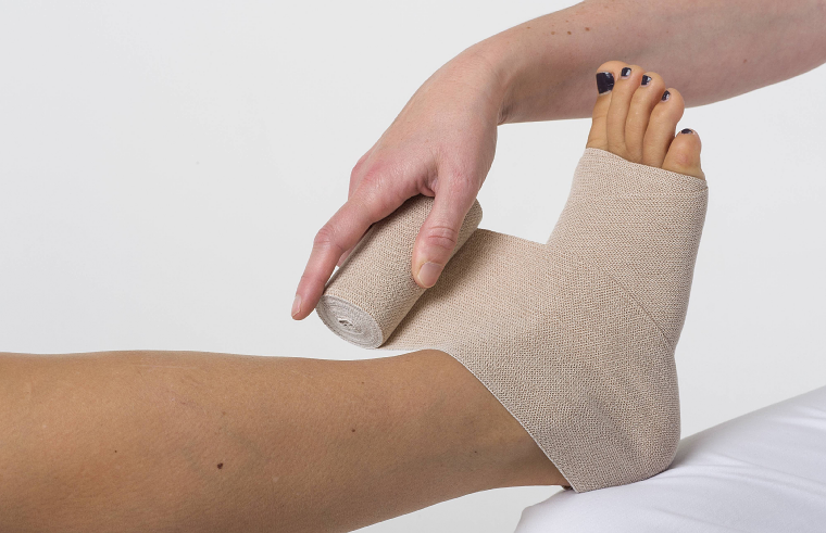 Start helt ude ved tæerne og kør 2-3 omgang rundt om forfoden, afhængig af fodens størrelse. Ved forfodsødem anbefales tættere anlæggelse i sildeben.