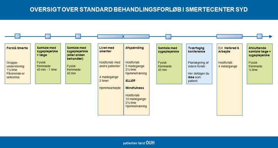 Herefter vil du blive indkaldt til vores obligatoriske undervisning ”Forstå smerten”, som foregår i Smertecentret som holdundervisning. Efter dette vil du modtage en indkaldelse til en samtale med en sygeplejerske og en læge (eller psykolog). Ved denne samtale planlægges den videre behandling i samarbejde med dig. Sygeplejersken vil være din kontaktsygeplejerske gennem hele dit forløb i Smertecenter Syd.
