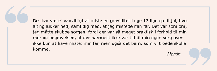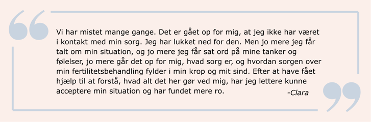 Sorg opstår typisk som reaktion på et tab af en betydningsfuld person eller livsdrøm. I fertilitetsbehandling kan vi opleve tab af livsmål, tab af et barn, der ikke kommer, og tabet over ikke at være en familie endnu. Sorg kan blive aktiveret i flere situationer, når der er tale om tab af en graviditet. Det kan være sorgen over barnet, der ikke blev til, eller smerten, når man gentagne gange konfronteres med ikke at være forældre.