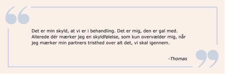 Når vi er i fertilitetsbehandling kan vi både opleve en indre følelse af skyld, som kan komme af vores egne tanker om, at vi ikke gør det godt nok. Men skyldfølelsen kan også blive aktiveret af vores omgivelser - en ydre skyld, om at vi ikke gør det rigtige.