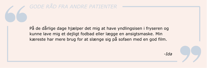 - Et negativt udfald? Har jeg brug for alenetid eller kontakt? Andre af vores patienter har givet udtryk for, at det ved behov for alenetid fungerer at gå en tur med podcast i ørerne, lave yoga eller en meditationsøvelse. Ved behov for kontakt kan en gåtur sammen i skoven, en fælles kop kaffe og en snak, et dyp havet, eller en aftale om at tage ud at spise være hjælpsomme.