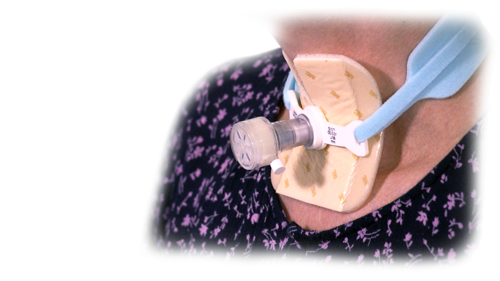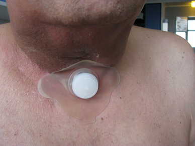 Trakeostomien gør det muligt at trække vejret via hullet i halsen.