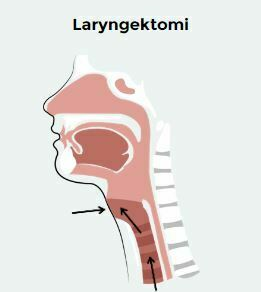 Ved laryngektomi er struben fjernet og luftrøret ført ud som en stomi fortil på halsen (billedet nederst til venstre). Der er slet ingen passage af luft via mund og næse, patienten trækker udelukkende vejret via hullet i halsen (se patientforløbet "Strubeløse" under F- Øre-Næse-Halskirurgisk Afdeling på Mit Sygehus).